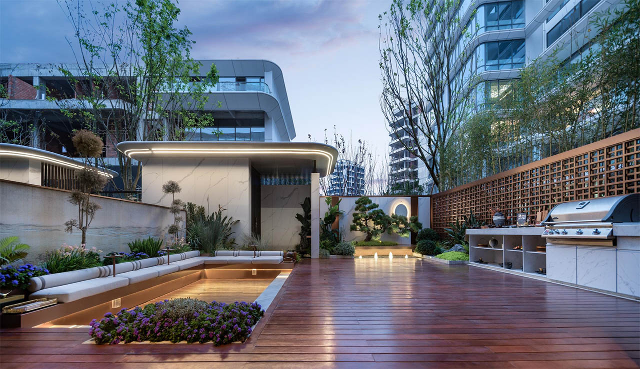 为了给塔尖人士打造出住假生活体验,借助地块整体地势高差,打造了峡谷式的园林和层峦叠翠的绿植布景,内部大致可分为东、西两部分,其中东侧为墅区,西侧为3梯2户的小高层楼栋,约35㎡U形露台,厚载生活雅趣、270°环幕观景视野,视野无界。