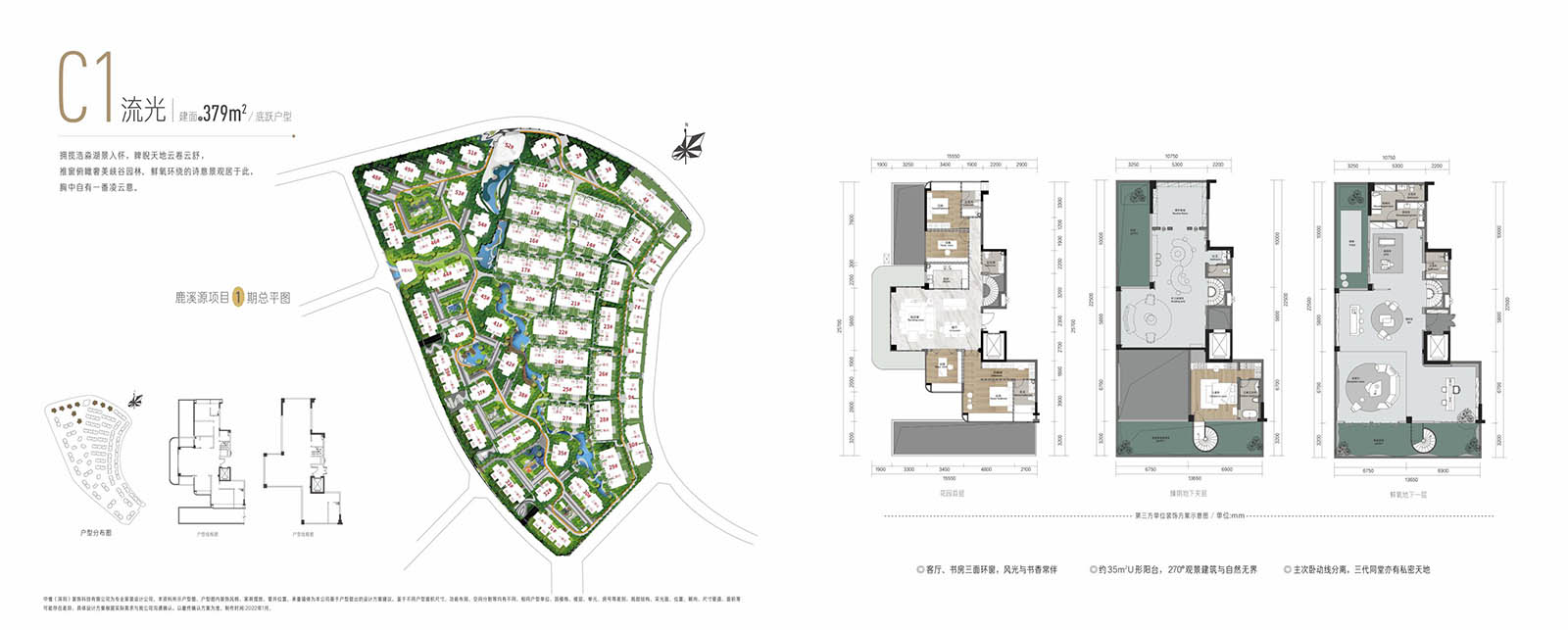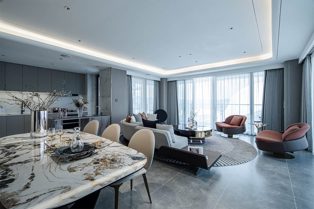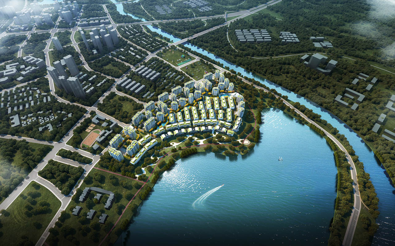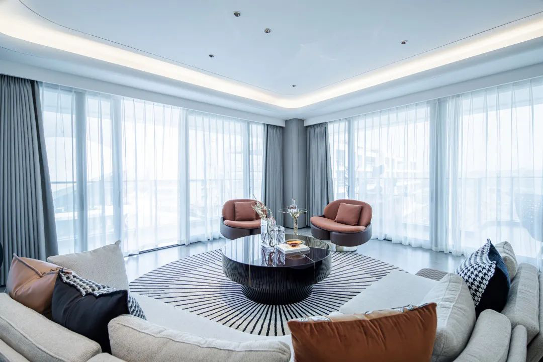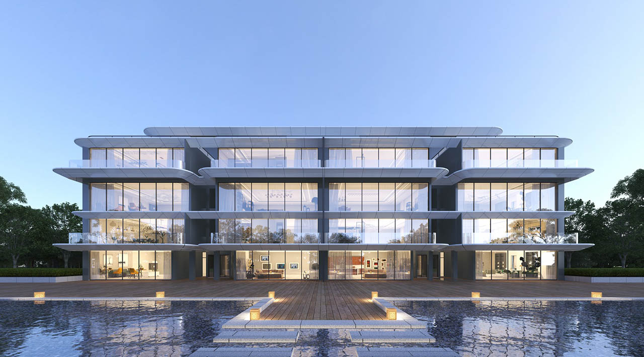 融合山水人城,犹如生长在公园里。整体占地约320亩,容积率仅约1.8。设计顺应原生丘陵地貌布局全端景墅大平层、臻钻岛院墅以及创世游艇豪宅,以大面积的玻璃幕墙设计,营造约50%窗地比,呈现超脱于市场的阔绰尺度,给予巨幅湖居的朗阔视野。