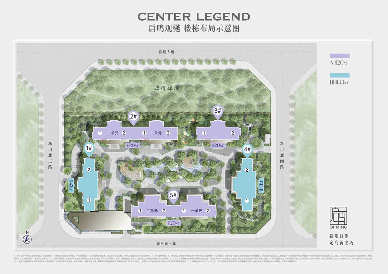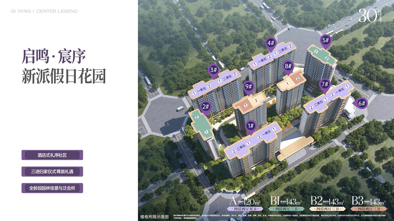 产品纯粹,只做了120㎡和143㎡两个面积段产品。启鸣双子均采用围合式设计,观樾打造围合式社区,南北楼栋整齐排布,楼间距拓展约94米,营造极致开阔的居住视野;宸序同样采用围合式布局,阵列+围合式排布,形成独特空间设计。
