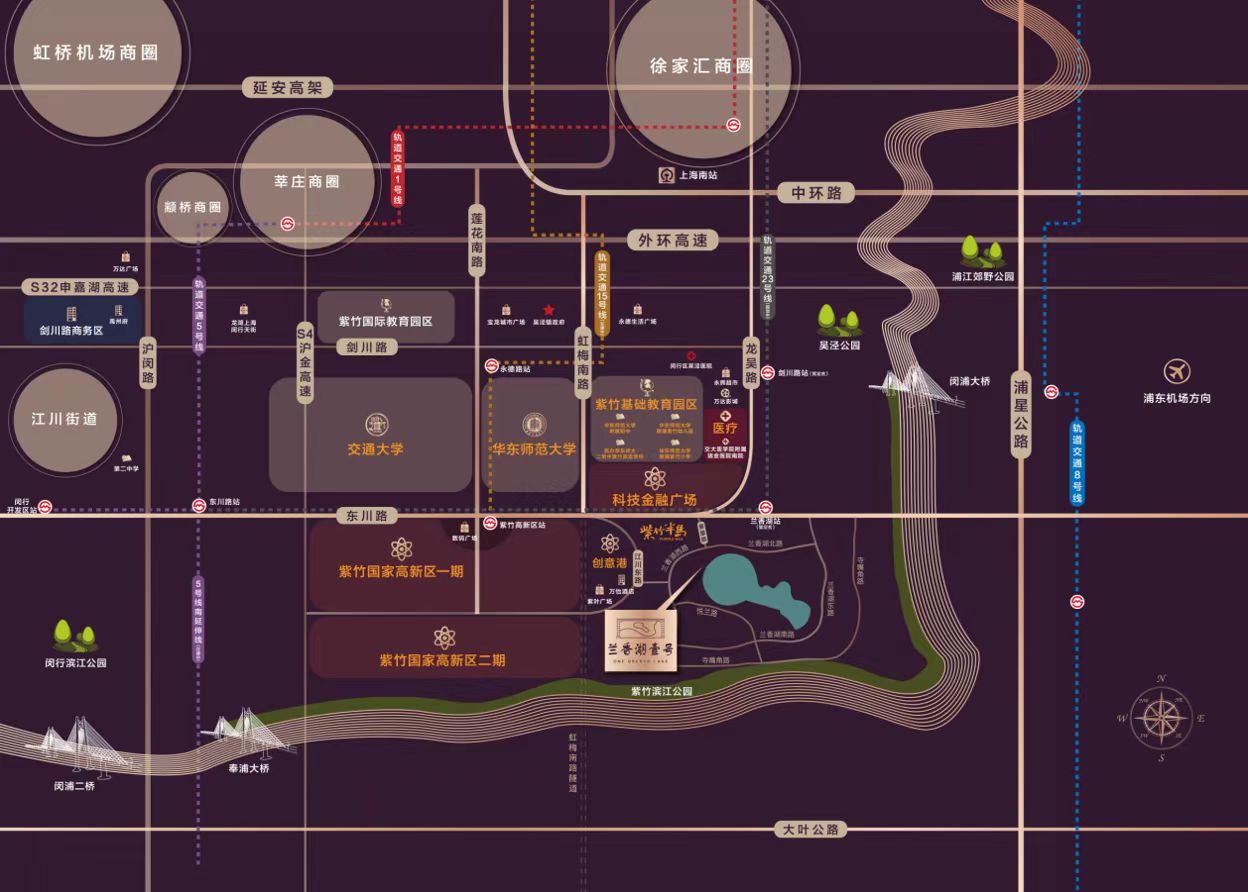 绕兰香湖而建,占据一线湖景资源,兰香湖占地近40万方,沿湖绿地面积共计8.3万方,湖体自黄浦江转角向内纵深1公里,扩展了湾滨江生态通廊的延展性和开放性,而且在上海8大湖系中,兰香湖是位于主城区的湖系资源。