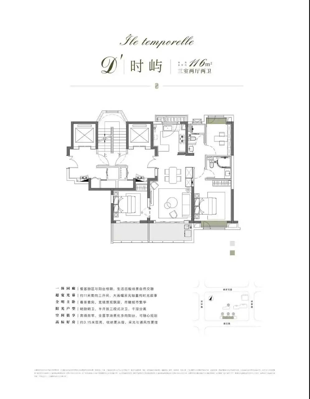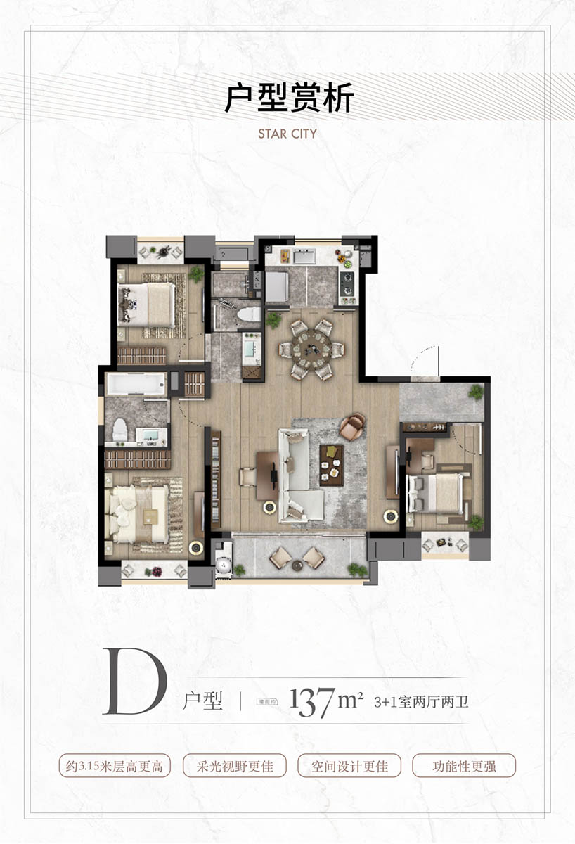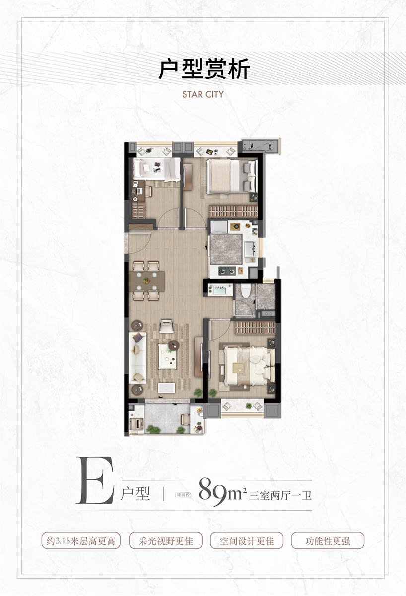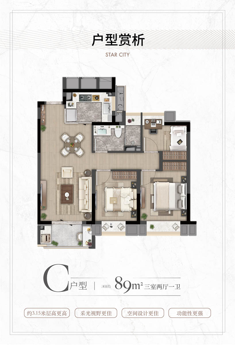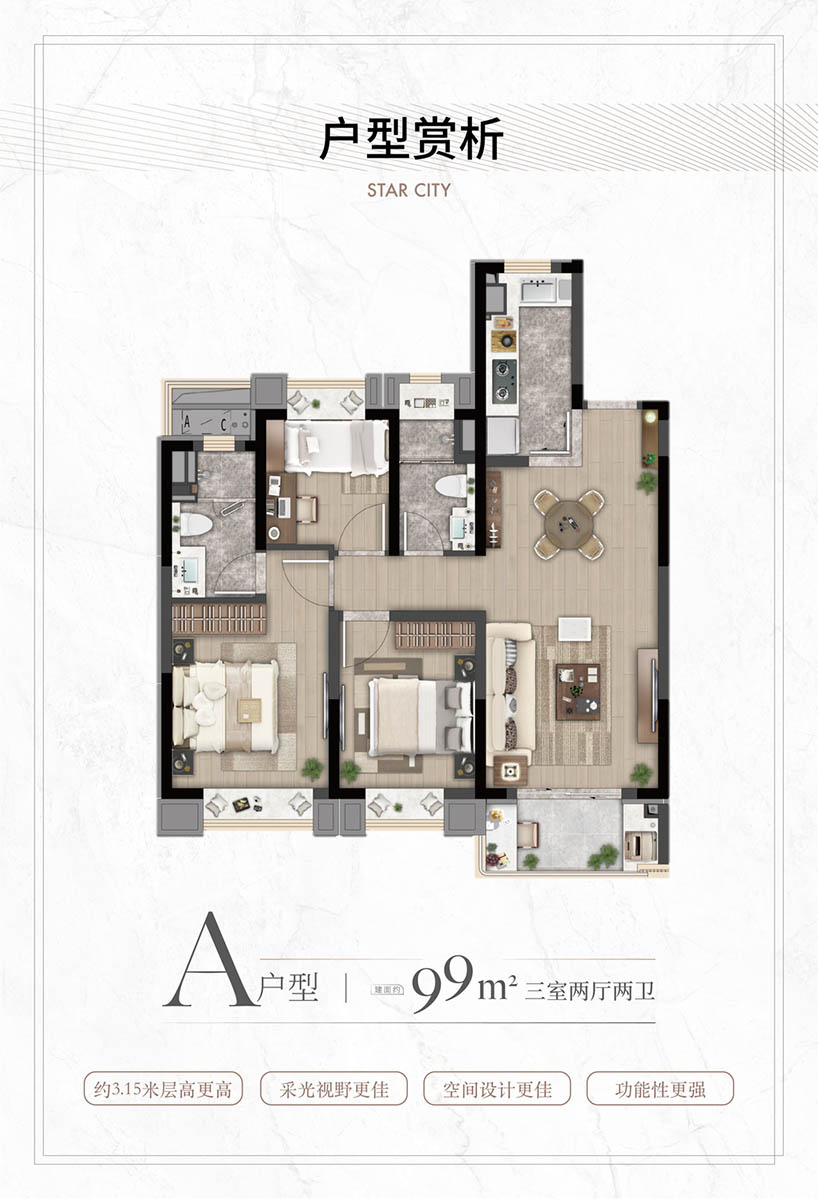 特邀业内知名的巨擘参与规划设计,层高约3.15米、不封阳台,有更多的附赠面积给业主,提高了空间利用效率;同时,户户配置地暖、新风、高端厨电卫浴等,皆采用知名品牌,为业主开启高品质的精致生活。